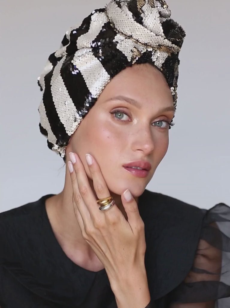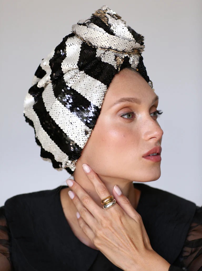 Rona’s Limited Edition sequin turban Collection. No outfit is complete without a bit of sparkle! This sequin turban gives you just that! The perfect finishing piece for any celebration or party, this turban is made from gathered stretch-jersey coated in hundreds of glittery sequins.  This stripped sequin turban is a st